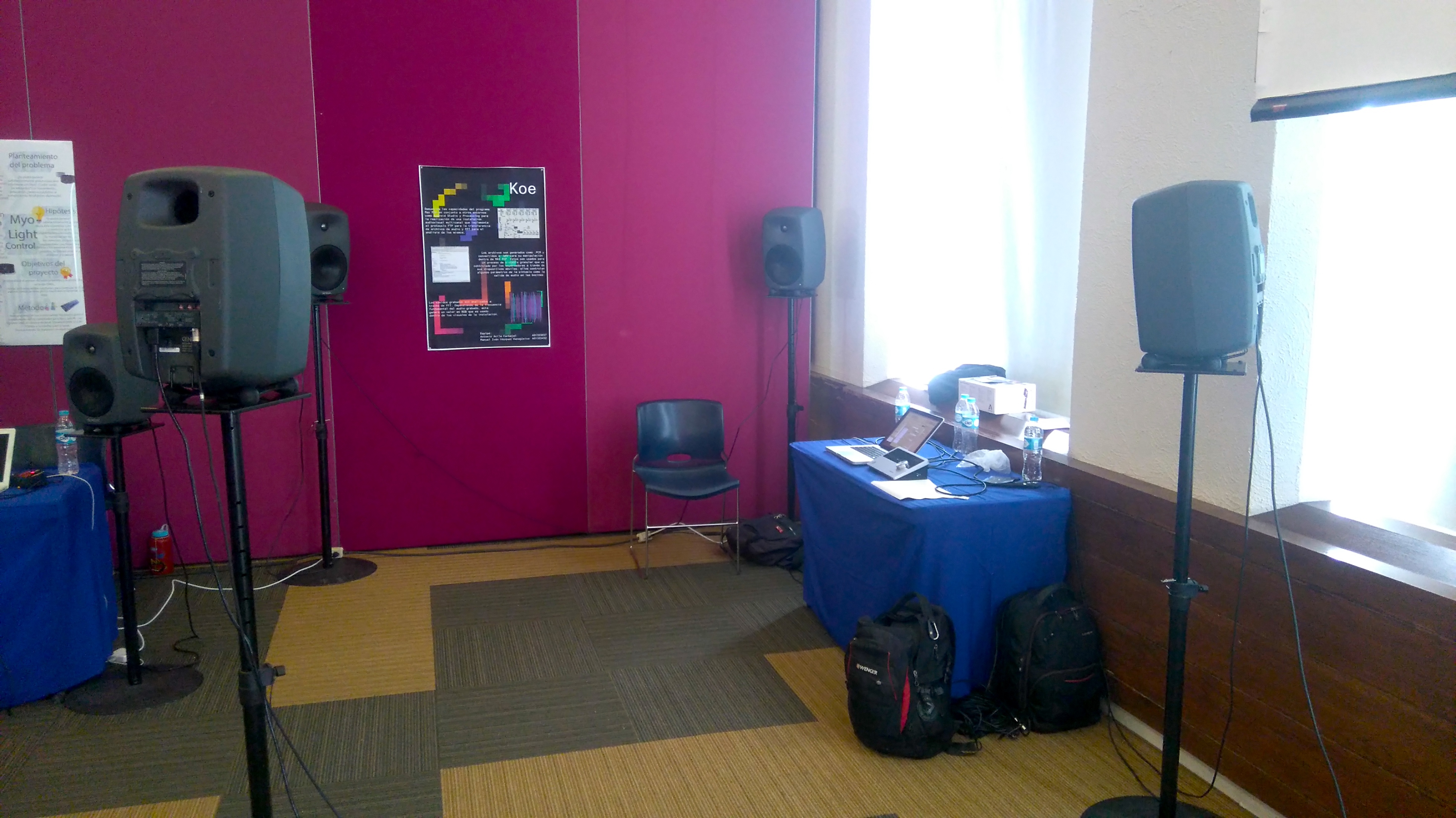 Koe, translated in Japanese as “voice”, is an interactive audiovisual installation using the smartphones from the public. With the microphone of the mobiles, each individual records an audio that will be processed in a server and played back on a multi-channel setup. Each one of the smartphones involved can control the processing and its location on the room with the accelerometer and screen.